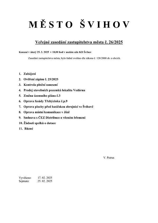 Pozvánka na veřejné zasedání zastupitelstva města konané v úterý 25.02.2025